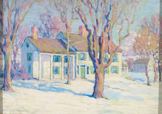 Oil on canvas. Winter scene. White house with green door and shutters. Addition to house on left with two story columns. Ground covered in snow. Tree in foreground partially obscuring view of house. Another house in distance on right. Blue sky, trees behind house colored in shades of purple. Wide wood frame painted gold. Note on back of stretcher "Colonial House, Litchfield/(Corner House)/Artist: Adelaide Deming"