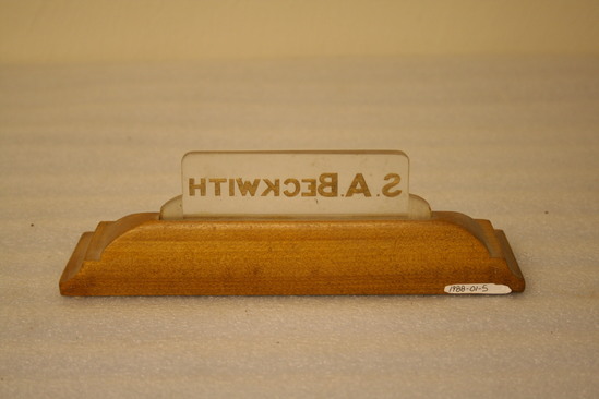 Rectangular wooden stand, llight colored wood, inserted in is a piece of clear plastic. On plastic in gold lettering "S.A. BECKWITH"