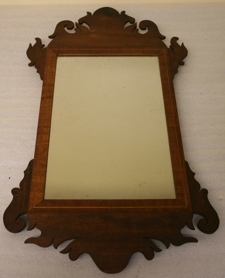 Oblong glass, band of medium dark wood with inlaid band of light wood in center. Top and bottom have fancy scroll saw Chippendale-style cutouts. Glass measures 13 3/4" long x 8 5/8" wide.