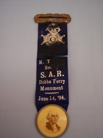 Yellow and blue stripped ribbon with brass pin on back. Gold star in center of ribbon. Oval shaped metal medal hanging from ribbon. Gold eagle at top. Oval center with Revolutionary soldier in middle. Oval surrounded by blue border with gold stars. Reverse side of medal has bust of General George Washington "Sons of the Revolution" and "1883" around his head.