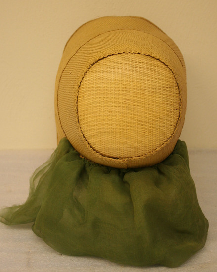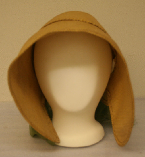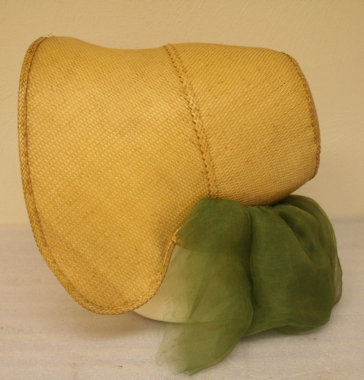 Natural colored straw bonnet in leghorn or poke bonnet style with elongated brim that wraps around wearer's face. Green silk fabric attached to bottom of bonnet around neckline. Unlined.