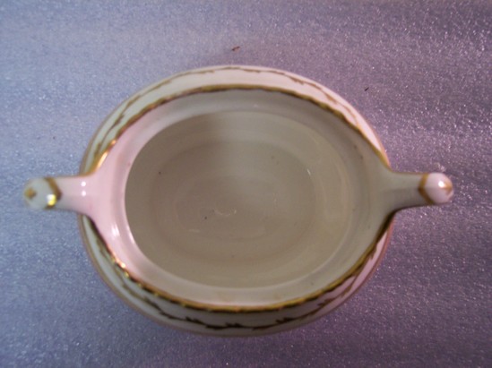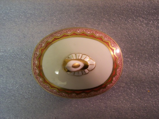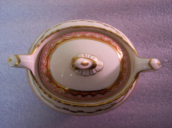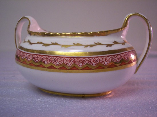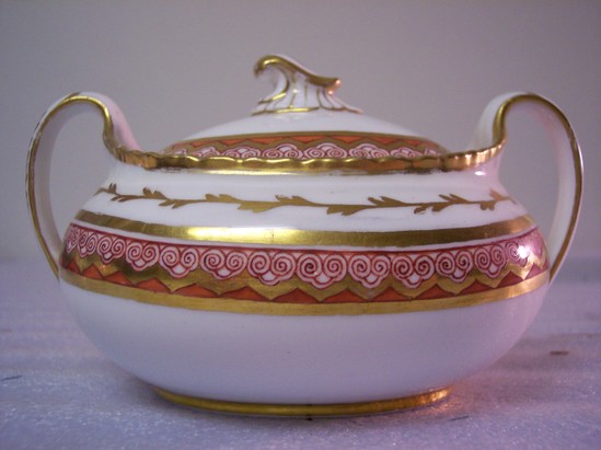 Sugar bowl has a gilt vine motif and is decorated with gold bands, gold lines on handles, and a band with a gold border and red leaf and scroll. Sugar bowl is oval and has two handles. This sugar bowl is heavier and slightly smaller than 1964-15-3 A-B and has a different lid finial (wave on petals). It was probably made later. Both bowl and lid are marked "Cauldon, England" and "J.Mc.D and S. Boston." Also "Ware" and "1895" are painted on the bottom. Asian inspired design. This is the wedding tea set of Anna Pierce Brace, (Mrs. Charles Loring, married May 6, 1818). Wedgwood #714, "Bittersweet." It was inherited from Mrs. Pennypacher's mother, Mrs. Ruth Loring Whitman; and by her from Mary Hopkins Loring; and by her from Anna Pierce Brace Loring.
