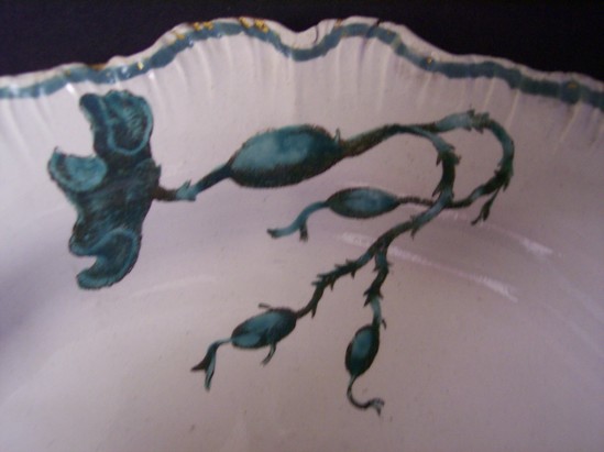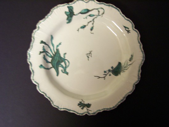 Earthenware and pearlware plate has ruffled edge. White with green borders. Green shell and sea flora decoration in black transfer print that has been overpainted by hand in green enamel. "Ammonite Shell" pattern. Stamped "Wedgwood" on bottom. Matches plate with the number 1968-02-12 B.