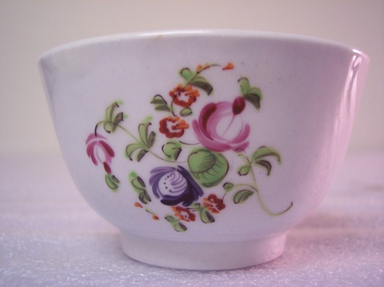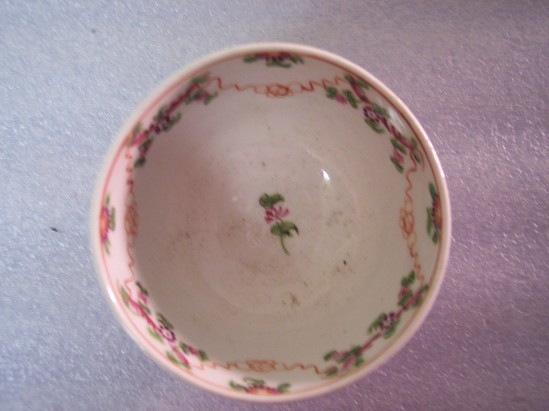 Tea cup (or bowl) decorated with garlands of flowers in polychrome and overglazed. No handles. Has single, small flower at base on the interior.