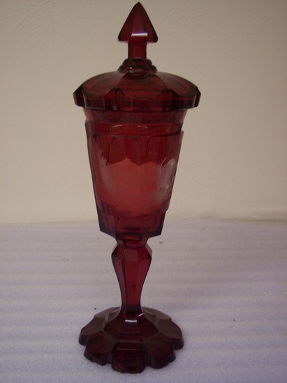 Ruby glass Bohemian Pokal or covered cup; scalloped base with octagonal faceted stem - clear glass engraved scene of stag and doe by forest pond. Octagonal segemented cover with engraved reverse S design with dots on top of cover - pointed finial on top.