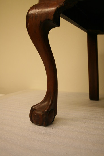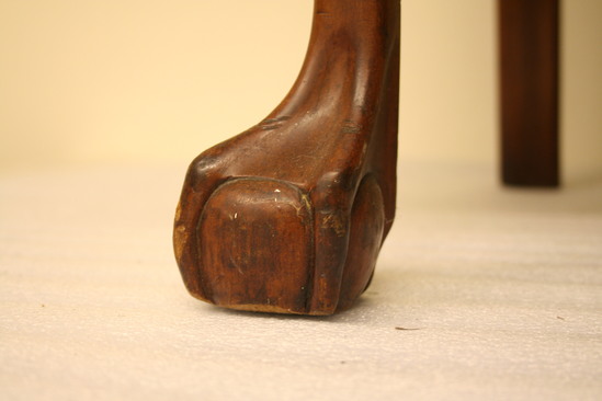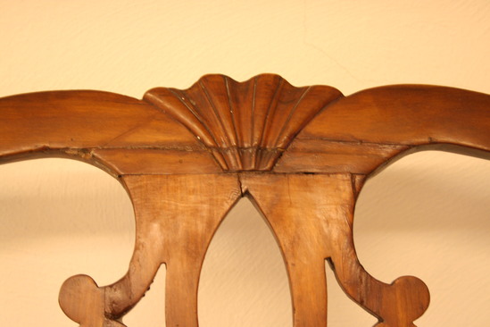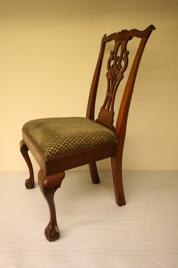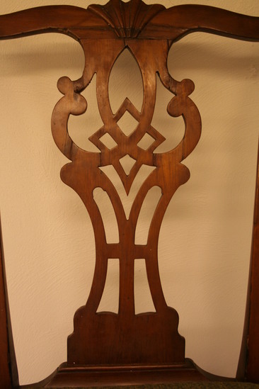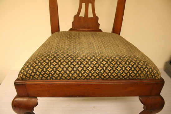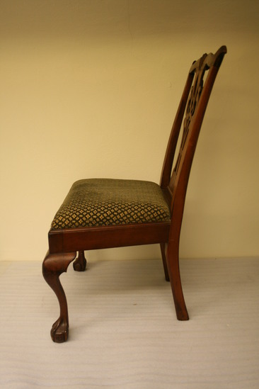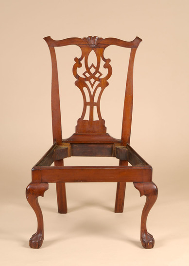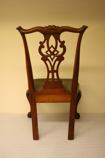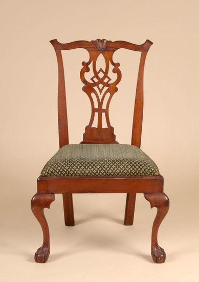 Pair of cherry wood side chairs. Slip seats. Front legs are cabriole with claw and ball feet. Raked back legs with champhered sides. Slip seat 21 1/2" wide at front tapering to 15" wide at back. Flared side uprights support yoke at top with turned back ends and scalloped design carved at center of crest rail. Figured and pierced splat in diamond centered pattern.