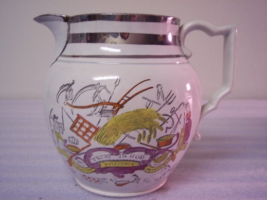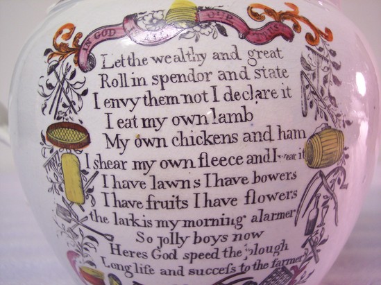 Bulbous jug or pitcher, with slightly elongated triangular spout. The handle is made in one piece with five segmented sections. Three silver luster bands decorate the neck of the pitcher, with the topmost band continuing across the spout. On one side, a variety of farming implements intermingle with the words "Trust in God" and "The Husbandman Diligence Provides Bread" above and below respectively. The other side is decorated with a poem, which is surrounded by various farming and household implements. The poem reads, "Let the wealthy and great / Roll in splendor and state / I envy them not I declare it / I eat my own lamb / My own chickens and ham / I shear my own fleece and I wear it / I have lawns I have bowers / I have fruits I have flowers / the lark is my morning alarmer / So jolly boys now / Here's God speed the plough / Long life and success to the farmer." Above the poem, in a ribbon swag, are the words "In God is all our Trust." Below the poem is "Industry produceth wealth" in a ribbon swag. Predominant colors are rose, orange, yellow, and black.