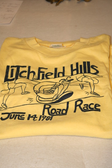 Yelelow short sleeved t-shirt. Logo on front center of shirt, printed in black. Two runners and a snail wearing a "5th Annual" sash. "Litchfield Hills" printed above logo. "Road Race/ June 14, 1981" printed below logo.
