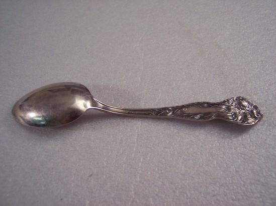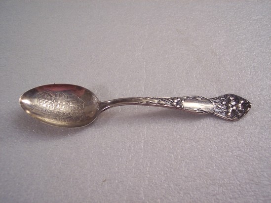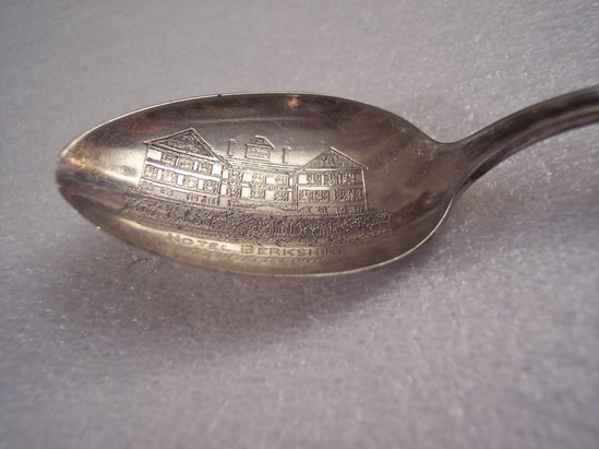 Silver teaspoon, bowl has etching of Hotel Berkshire building "Hotel Berkshire/Litchfield, Conn." written underneath. Handle ornate with floral design. Hallmark on back "STRATFORD SILVER CO. AXI"