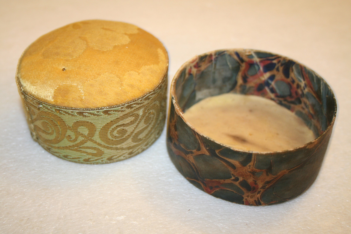 Pin cushion with yellow brocade top. Body of cushion made of blue marbelized paper with yellow bottom. Yellow brocade bed curtains under which Washington slept at Newburyport, Massachusetts on October 30, 1789