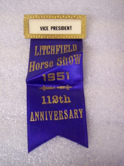 One judge's ribbon badge identifying "Vice President" of the Litchfield Horse Show. Rectangular brass plated nameplate with pin backing, the center with "Vice President" in black on white background behind clear plastic shield. Blue silk ribbon with embossed gold lettering "Litchfield Horse Show 1951 112th Anniversary"