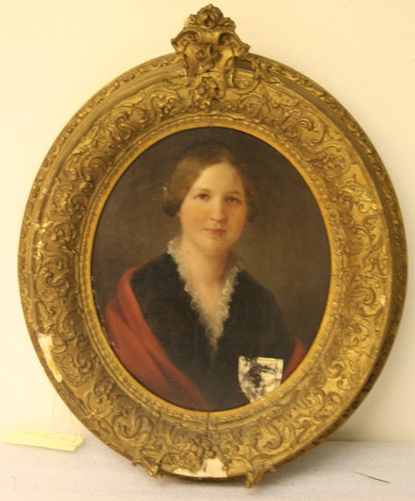 Small oval portrait of woman wearing a black dress with a V neckline. Neckline decorated with lace ruffled trim. Red shawl wrapped around her shoulders. Woman has brown hair parted down the middle and pulled back low, over her ears, at bottom of neckline. Framed in oval wooden frame with carved decoration. Three dimensional ornament at top of frame.