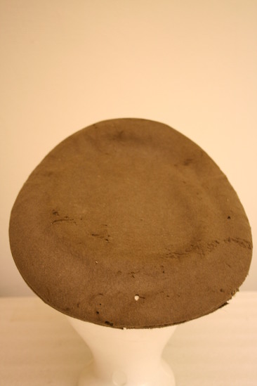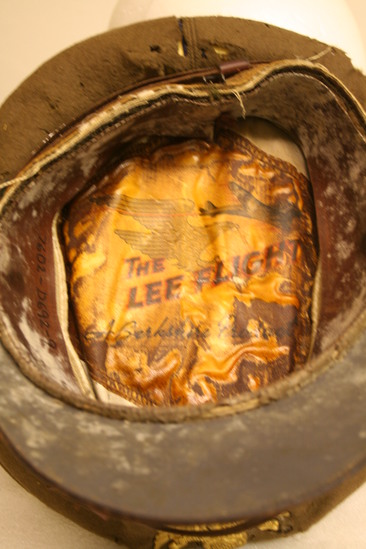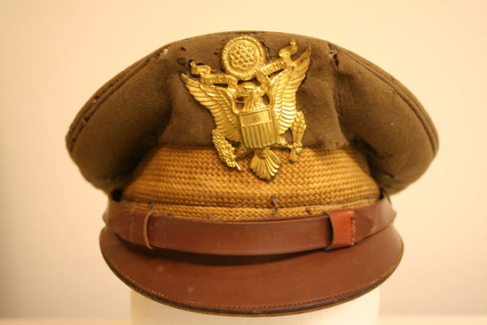 Peaked or service cap, World War II era. Brown/olive drab hat with flat top, tilted back (sides tallest in front) with a rounded edge along top; large gold eagle emblem in front, center of cap; gold/brown ribbon around base of cap; brown leather visor in front, brown leather band attached to two gold buttons with eagle emblem on either side of visor; running around edge of cap with adjustable buckle in back; interior has brown plastic band and white silk lining; yellow silk covered rod around edge of top; large tag with eagle and plane image "The Lee Flight a Berkshire Product."