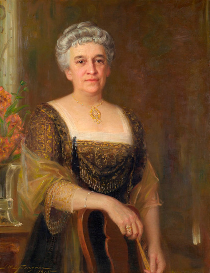 Oil on canvas portrait, 1/2 length, of an older woman standing in front of a fiddle back cahir, holding a fan on her hands, wearing a brown beaded dress with square open neck, net shawl, gold and pearl necklace with pendant. Flowers in a square Chinese silver vase on table to left.