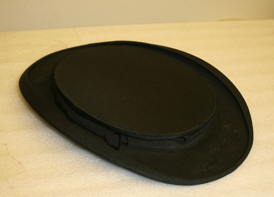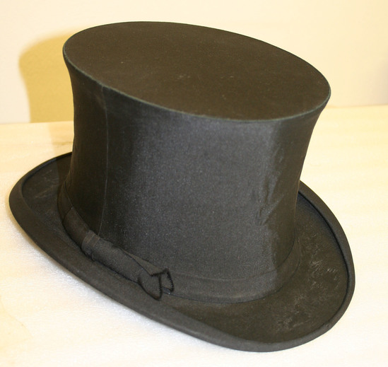 Man's collapsible top hat - covered in black grosgrain silk. Ribbon around circumference of hat with bow on one side. Brim upturned on each side of hat. Label on inside of hat "Founded 1880 London/De Pinna/Fifth Avenue/New York" in gold with crest above it. Body of hat comprised of metal wiring that allows top of hat to collapse.