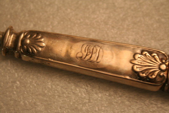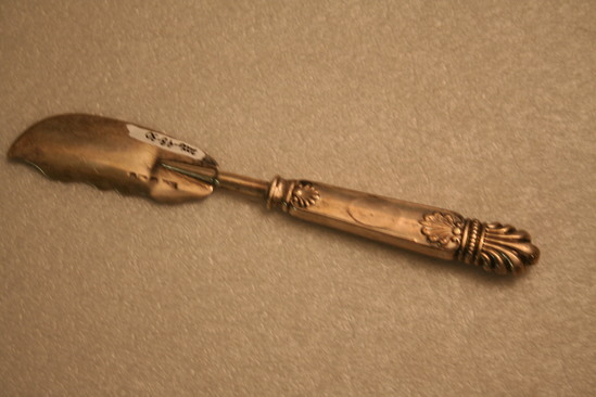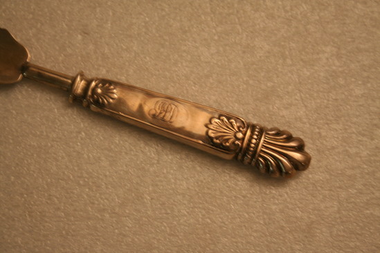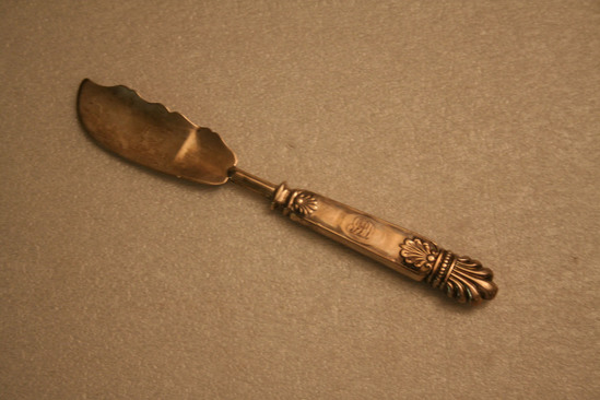 Coin silver cheese knife. Wide flat blade, one side slightly upturned with a shaped edge. Handle thicker with a scalloped leaf design on end. "JDD" monogrammed in center of handle. Maker's mark worn away on back of knife blade