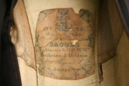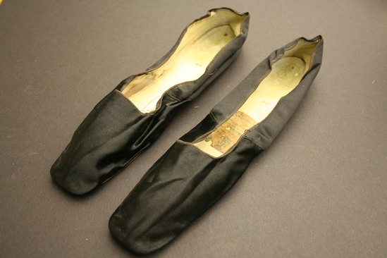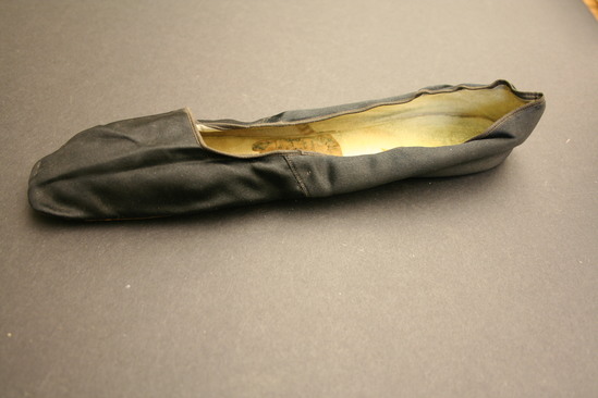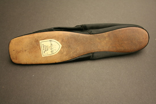 Black satin slippers with white leather inner soles and sides; brown leather sole; inside left slipper label "No. 32 Rue de la Paix/ Pres le Boulevard a Paris/ JACOBS/ Cordouievieu de S.A.K.M/Duchesse d'Orleans/179 Regent St./London"