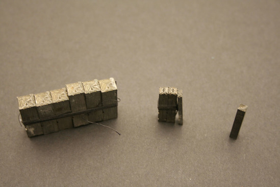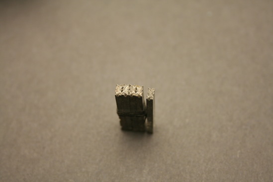 A: Steel die; six individual ones all of same design which have been tied together with a thin steel wire; design is floral and predomiantely in one corner; each piece has an incised line in one side near bottom of die B: Steel die; four individual ones all of same design which have been tied together with a thin steel wire; design has two lines which start at top center and move away from each other ending in a curly que at end; two swirled lined underneath this at center; each individual die has two incised lines of same size near bottom C: Single die; top has floral like design predominately in one corner; two incised lines of same size near bottom
