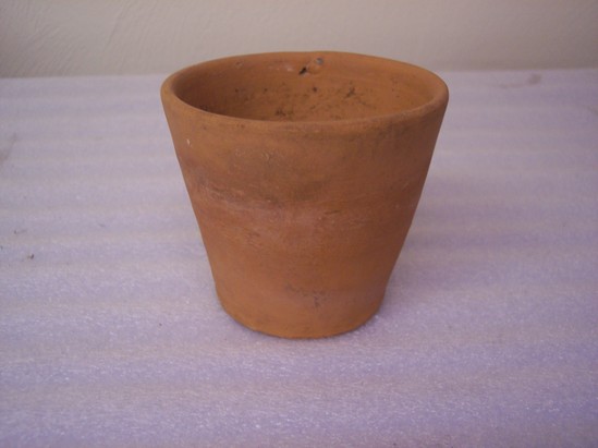 UNGLAZED POT WITH PLAIN RIM AND BASE. BASE HAS CENTRAL DRAINAGE HOLE.