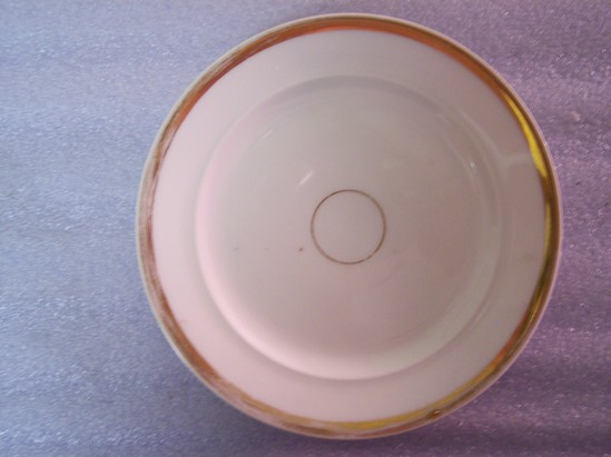 Round, white plate with wide gilt band around its edge and a small gilt circle at the center of the plate.
