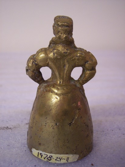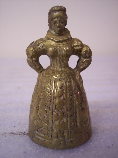 Cast brass bell, reproduction of Italian or English bell; woman with arms on hips in 16th/17th century dress. Clapper is formed by feet of woman