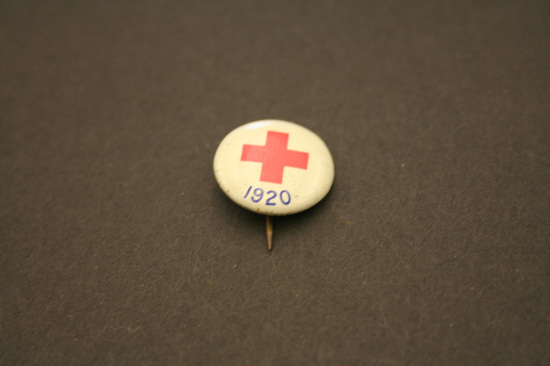 Round white pin-back button, stick pin on back, red cross in center "1920" underneath in blue.