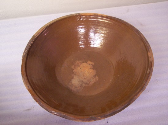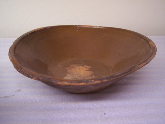 LARGE PAN WITH SLOPING SIDES, PLAIN RIM AND BASE. CLEAR GLAZED INTERIOR, UNGLAZED EXTERIOR.