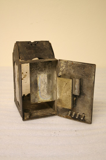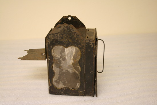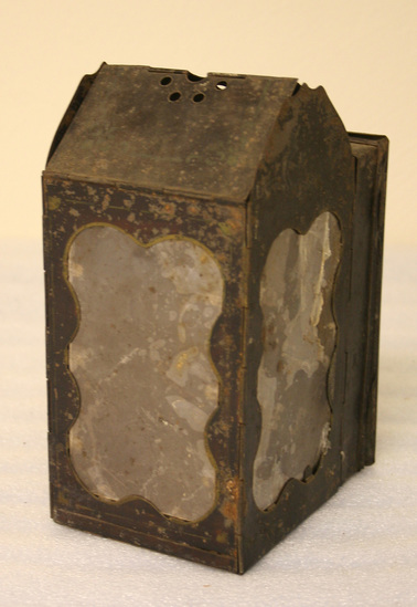 Japanned tin latern with faint stenciled border design. Labeled "Minor's Patent Jan. 24, 1865" Two mica panels. Collapsible hinged lid. Tinder box on hinged back door.
