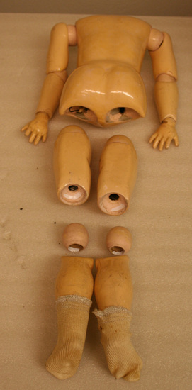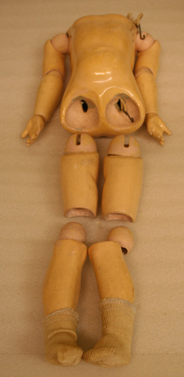 Doll with bisque head, glass eyes that move. Body is made of papier mache with joined arms and legs. Arsm are joined at elbows and wrists. Legs are jointed at hips and knees. Joints are wood painted flesh color. Removable wig at top of head. Stamped on small of back "EXCELSIOR/DRP No. 70685/GERMANY"