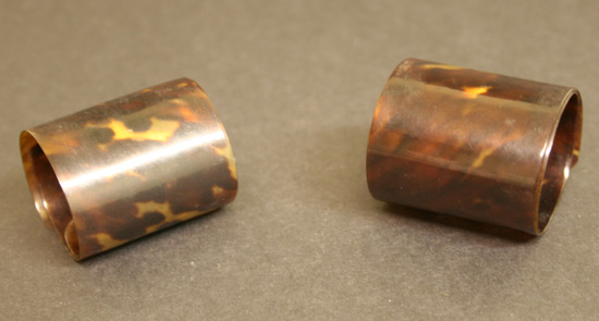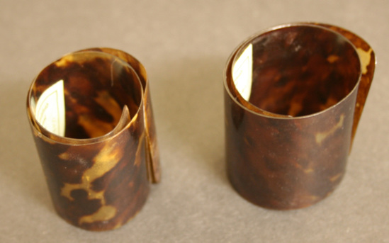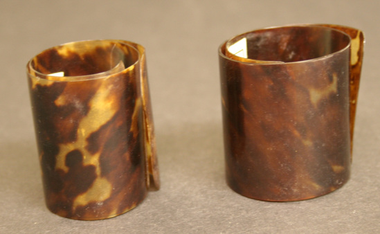 Pair of tortoise shell wrist band bracelets. The shell has been cut into thin bands and then rolled to conform to shape of wrist.