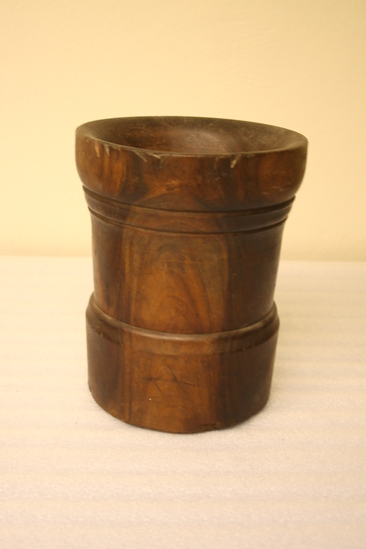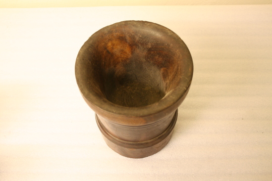 Hollowed out from a crotch cherry log and turned bevel at top of round base. Flared body. Raised band between 2 V shaped grooves and round top. Inside depth 6 1/4"