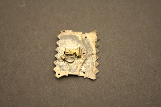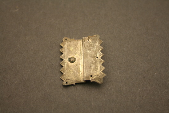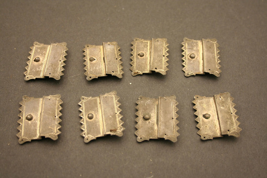 Eight identical buckles - each consisting of two pieces; pieces are identical reflections of each other with exception of raised rounded knob on center of one piece; outer edges of both are repeating pointed border with down turned leaf in each corner; double incised line runs along all four sides, two holes - on opposite ends of eah side of buckle
