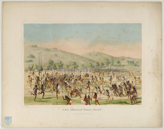 Printed in New York City by Currier & Ives 152 Nassau St. New York City, NY after the original painting by George Catlin. Pictured are hundreds of Native American males holding lacrosse like sticks and running around in game play. Two large goals have been erected. One in the left foreground and the other in the right background. Spectators are visible in the background along the edge of the playing field.