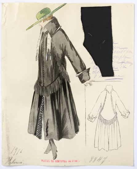 Lithograph and watercolor on paper fashion design. Afternoon coat in black, soft satin with chenille fringe and an ermine tie. Fabric samples accompany rendering.