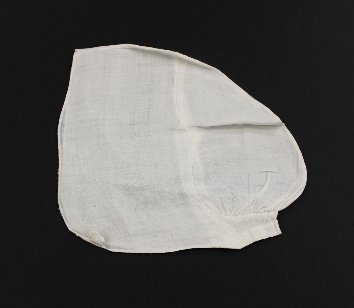 Off-white sheer cotton child's bonnet; unadorned; scalloped section; gathered at center back; ties