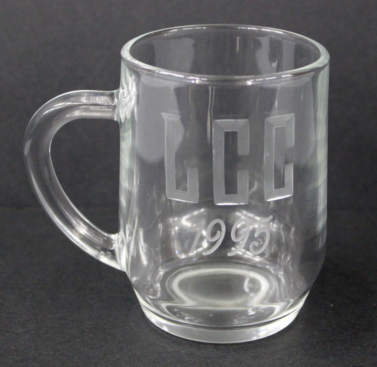 Award mug won by donor at the Litchfield Country Club. Simple glass mug with single-curve handle and rounded rim. Mug widens towards bottom before tapering at base. Etched in glass on one side, "LCC/1995." Mold lines visible. Raised lettering on bottom, "USA/40."