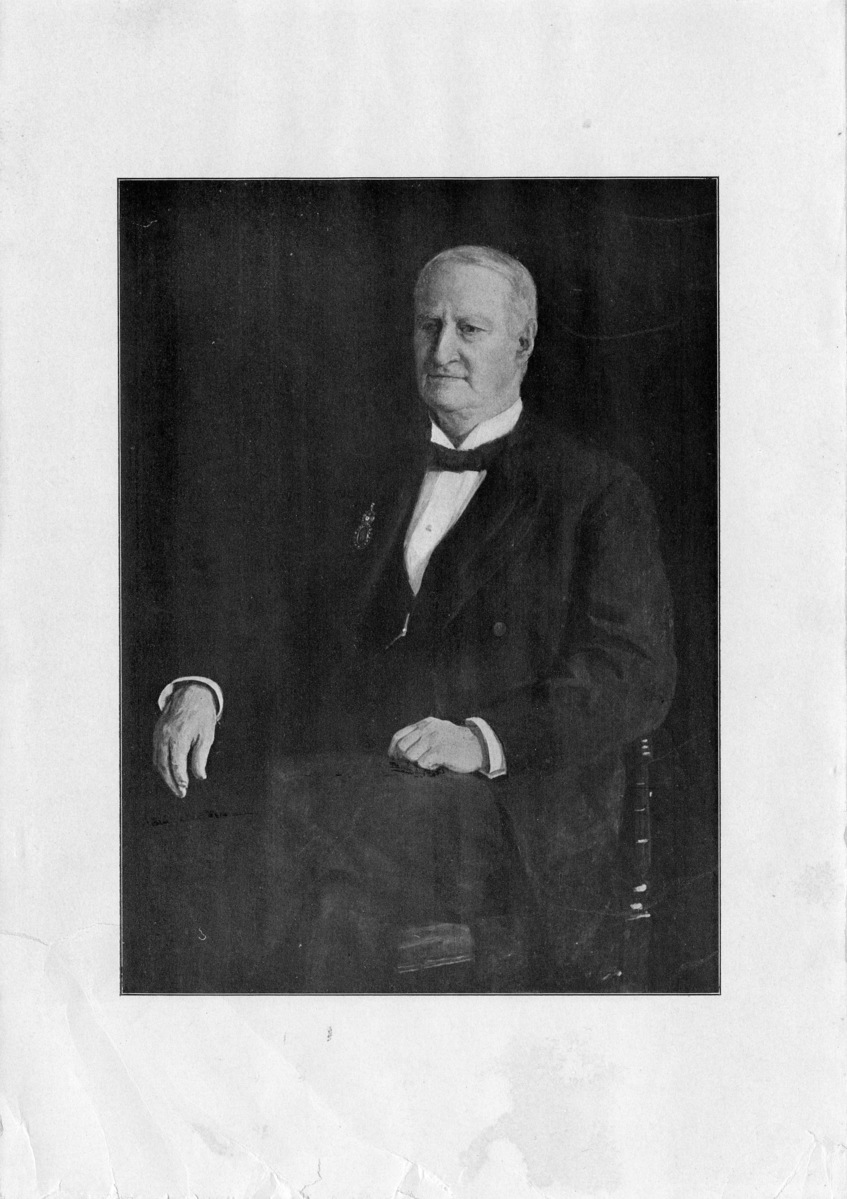 Rectangular print of Frederick A. Tallmadge. Depicts an older gentleman seated in wooden chair with legs crossed facing slightly left and wearing a suit, bow tie and brooch.