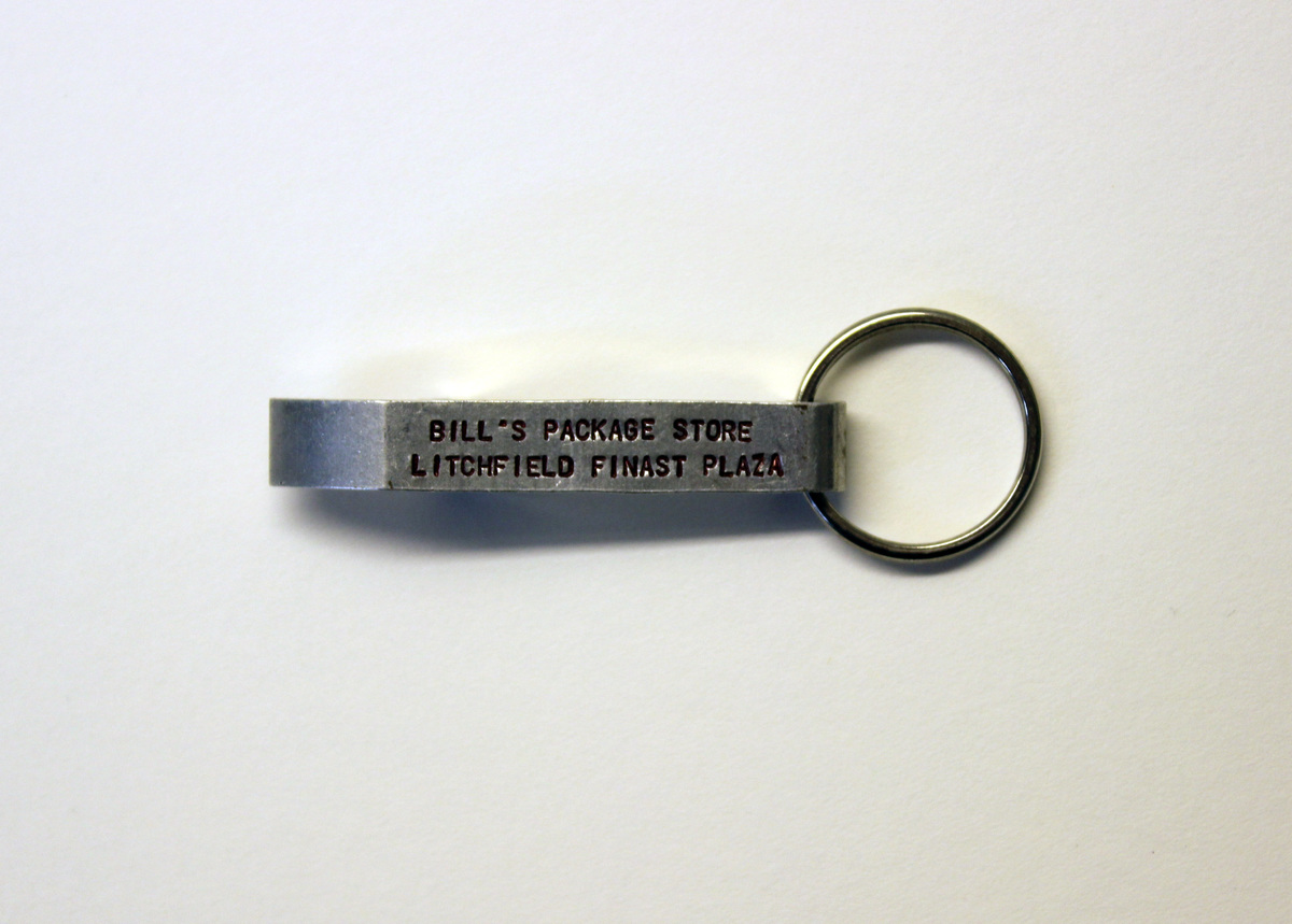 Aluminum key chain in the form of a bottle opener. Narrow fulcrum and tooth with straight handle. Loop at end of handle with metal ring attached. Engraved on top of handle with red text, "BILL'S PACKAGE STORE/LITCHFIELD FINAST PLAZA."