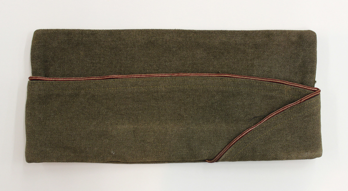 Olive drab wool garrison cap, World War II era. Maroon and tan silk cording along folded edge. Khaki cotton band inside along outer edge. No lining.