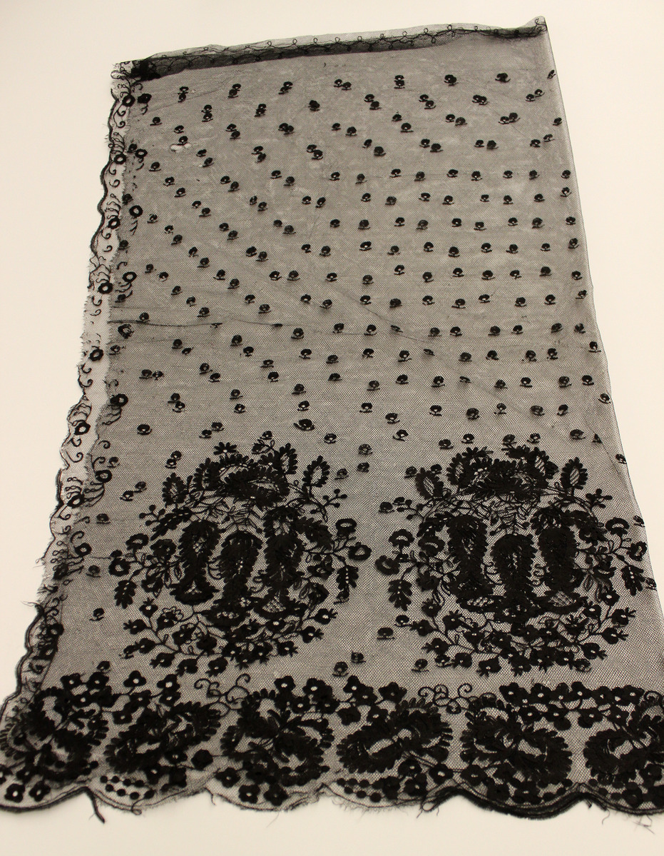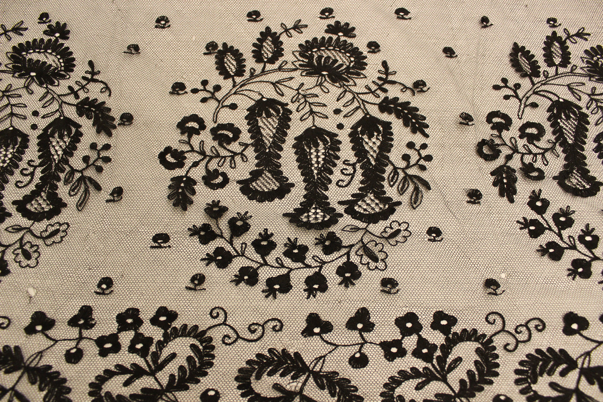 Black embroidered, rectangular veil with floral motifs, likely mourning. Hemmed edges at top, unfinished edges on sides.
