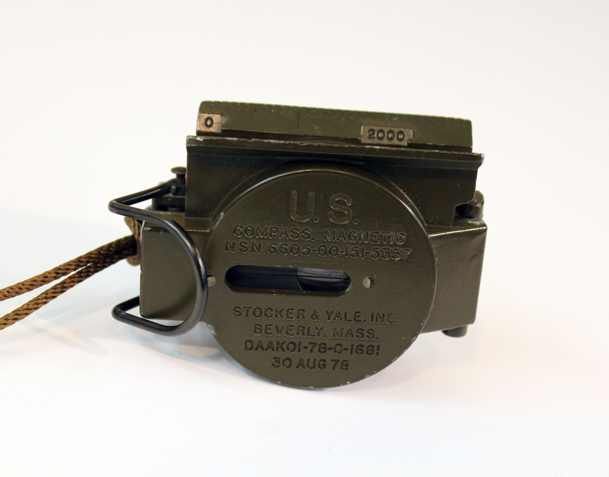 Dark olive green, hinged compass. World War II era, likely military issue. Meter marks along top edge. Cord attached on one side, with metal wire closure. Imprinted on hinged lid, "U.S./COMPASS. MAGNETIC/NSN 6605-00-151-5337/STOCKER & YALE, INC./BEVERLY, MASS./DAAKOI-78-0-1681/30 AUG 78." Compass face underneath lid.