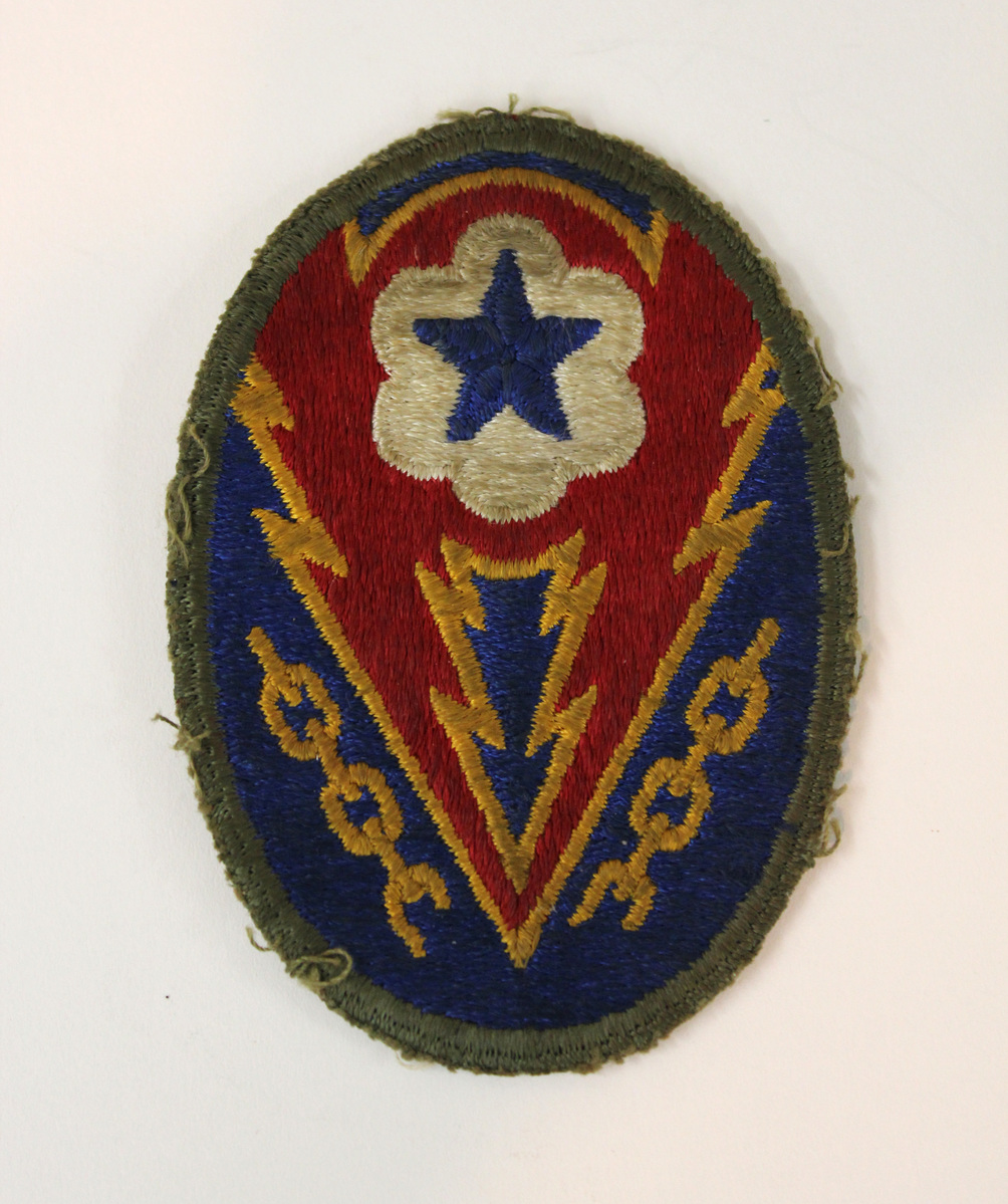 World War II era shoulder sleeve insignia for HQ ETO (European Theater of Operations) and Communications Zone. Oval patch with blue background and olive drab border. Red lightning bolts with blue star in white multifoil shape, with gold chains underneath, Cut edge and snowy reverse.