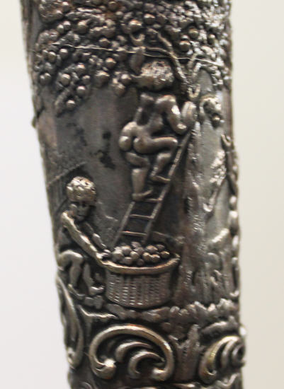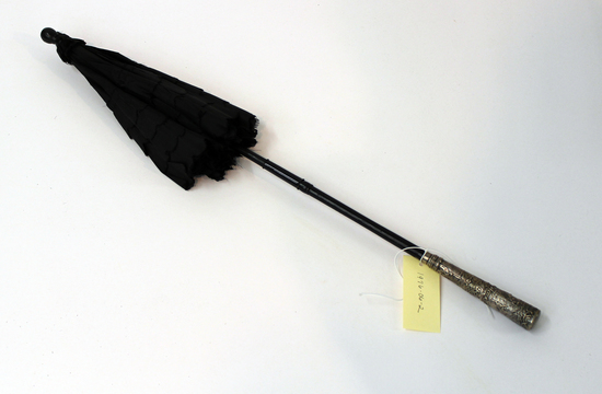 Parasol; folding; mourning; black silk lining with black silk cover with pinked scalloped edges and four layers of self-ruffles at base of cover; black ruffle at base of ferrule; black painted wooden knob-shaped ferrule; black painted tube with long silver response handle depicting a bucolic farm scene with naked children picking apples; Marks: 800 / S in circle / H in square / STAR