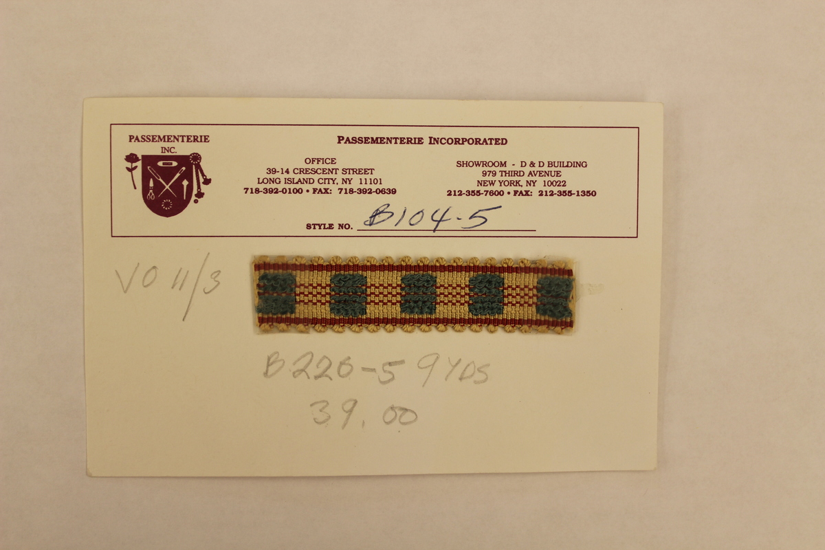 Strip of silk textile trim attached to a card with manufacturer information and style number. Trim has tan background with five large blue rectangles embroidered on top. Rectangles are raised off the background. Three red lines run across the strip horizontally. Through the center of the rectangles on the top and bottom edges of the strip is a thicker red line running horizontally. The top and bottom edges have small loops of tan thread.