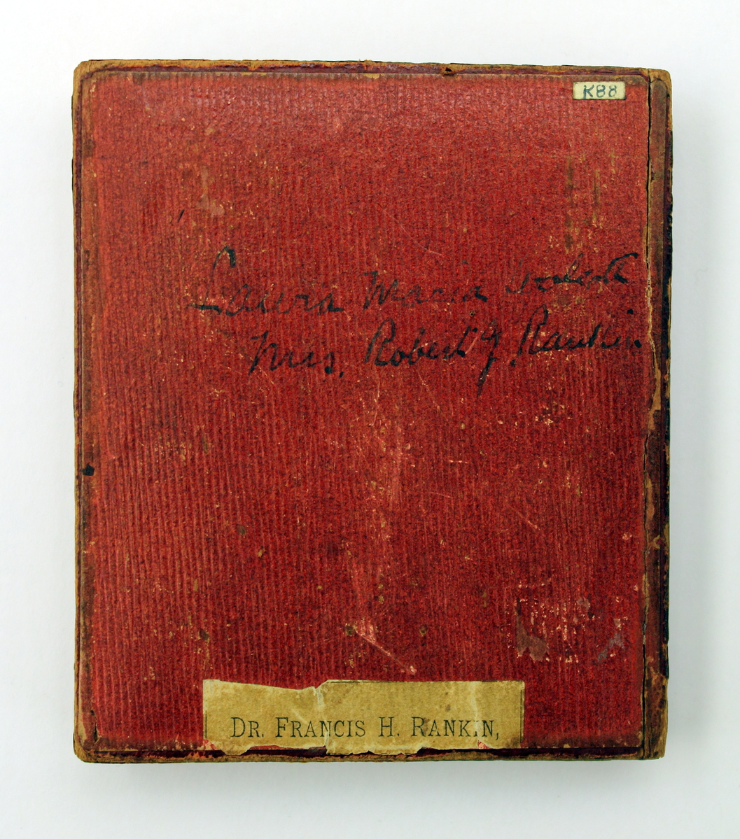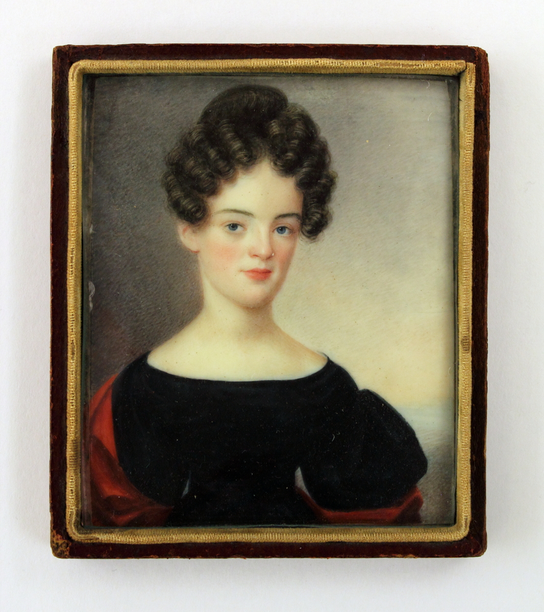 Rectangular watercolor on ivory portrait miniature of Laura Maria Wolcott Rankin (1811-1887). Miniature shows a half-length portrait of a young woman, facing right. Sitter wears a black dress of silk with a wide neckline and puffed sleeves, cinched at waist. Red shawl over her shoulders. Sitter has dark brown curly hair and blue eyes. Miniature is set in a rectangular case of tooled red leather, under glass with velvet spacer. Originally a hinged case, the top is separated and missing. Written on reverse of the case, in ink, "Laura Maria Wolcott/Mrs. Robert G. Rankin." Paper label pasted underneath, "Dr. Francis H. Rankin."