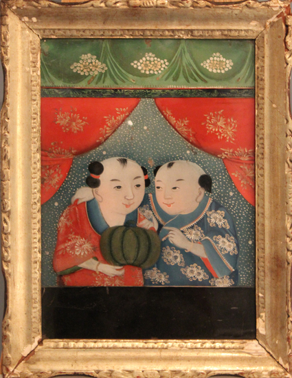 Reverse painting on glass of two Asian men. The two figures are shown standing side by side under two red curtains that have been drawn apart. One man wears a red kimono and holds what appears to be a gourd in his hands. The other man stands beside him with his right arm around the other man's shoulders and is gesturing as if in conversation. This man is dressed in a blue kimono. Below the scene of the men is painted a strip of black, and above the scene is a green field with a stylized leaf pattern.