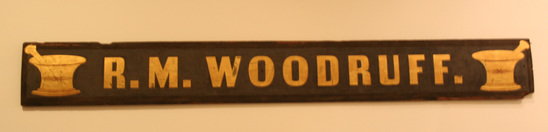 Long rectangular wooden sign, painted black. In gilt lettering across length of sign "R.M. Woodruff" On either side of name is a figure of a mortar and pestle done in red stenciled drawing with black sand paint ground.