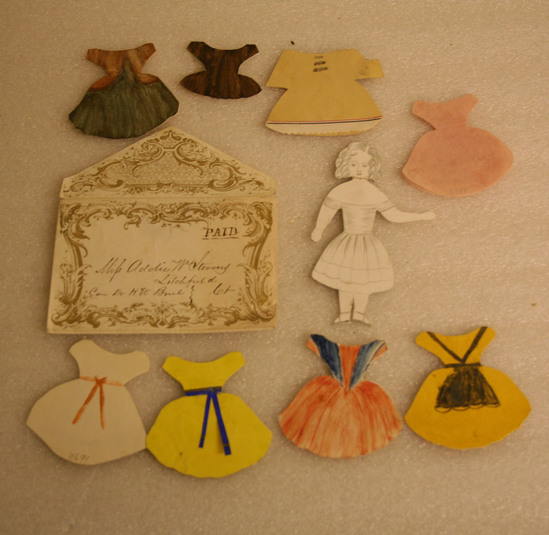 Female paper doll made of stiff paper. Face, hair, undergarments and shoes drawn in pencil on front. Written on back of doll "Mary Stevens" 8 dresses accompany paper doll and have been colored by a child with crayons. Stored in an envelope printed with fancy gilt designs on both sides and addressed "Miss Addie W. Stevens/Litchfield/Ct Case of Dr. H.W. Buel"