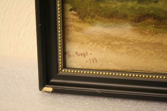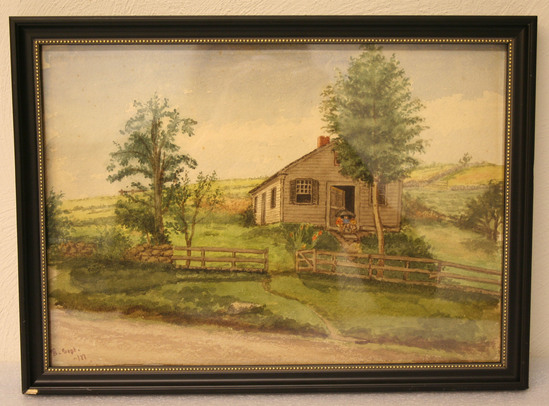 Watercolor of building with three children sitting on the front steps. Building set on knoll above dirt road. Board fence in front. Hillside meadow in back. The front door in gable end on street is open and three children are seated on door sill under an umbrella.