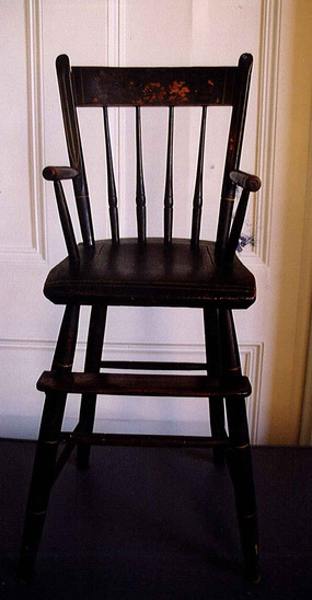 Black highchair with stencilling on top slat. Painted rings and designs throughout